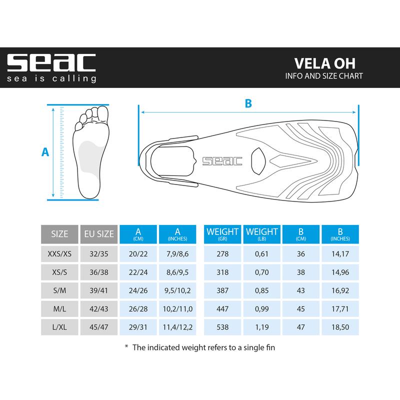 Seac Vela Oh Fins The Seac Vela OH short fins reduce fatigue during snorkeling, thus improving the experience at sea. These are easy to wear thanks to the practical rubber strap adjustable in 6 positions. The fit is very comfortable thanks to the soft rubber of the open shoe that holds the tip of the foot firmly. The short blade has grooves that improve water flow and anti-shock rubber edges. The Seac Vela OH swimming fins are flexible and resistant and can also be used for swimming training. Key Features: Short fins perfect for snorkeling in the sea and for swimming in the pool, flexible and resistant, to get the best from every kick. Ergonomically designed soft rubber foot pocket that fully wraps the tip of the foot. The strap, adjustable in 6 positions, with reinforced heel, keeps the fin firmly in place avoiding any discomfort and loss of thrust. The short blade of the Seac Vela OH swimming fins has grooves to improve water flow and anti-shock safety rubber edges